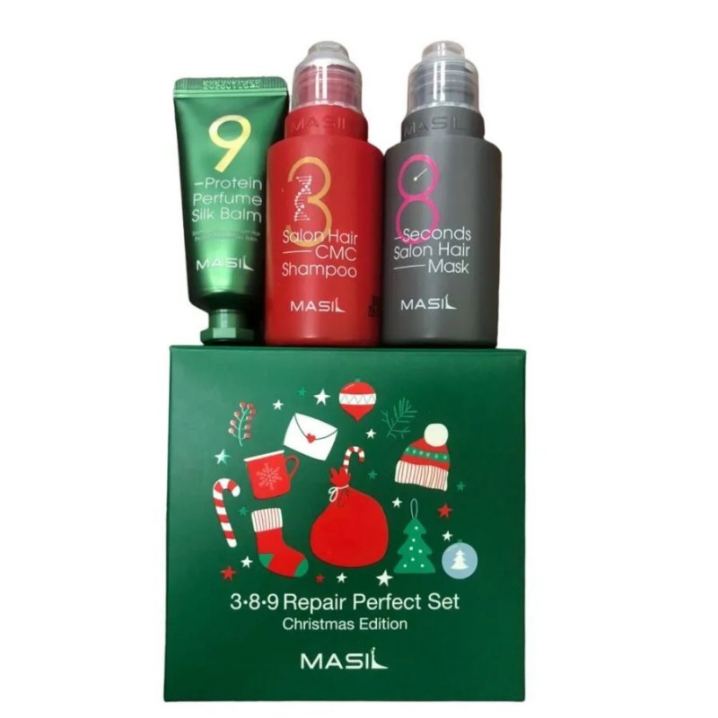 Рождественский набор Masil 3*8*9 Repair Perfect Set Christmas Edition для восстановления волос помогает в кратчайшие сроки устранить сухость, ломкость и предотвратить сечение прядей. Уплотняет, смягчает, наполняет волосы влагой, делая их мягкими и шелковистыми.- Восстанавливающий шампунь 50 мл с аминокислотами Masil 3 Salon Hair CMC Shampoo глубоко увлажняет волосы, не утяжеляя их, придает блеск, здоровый вид и способствует улучшению роста волос. Шампунь питает волосы, борется с их выпадением, обеспечивает гладкость и шелковистость.